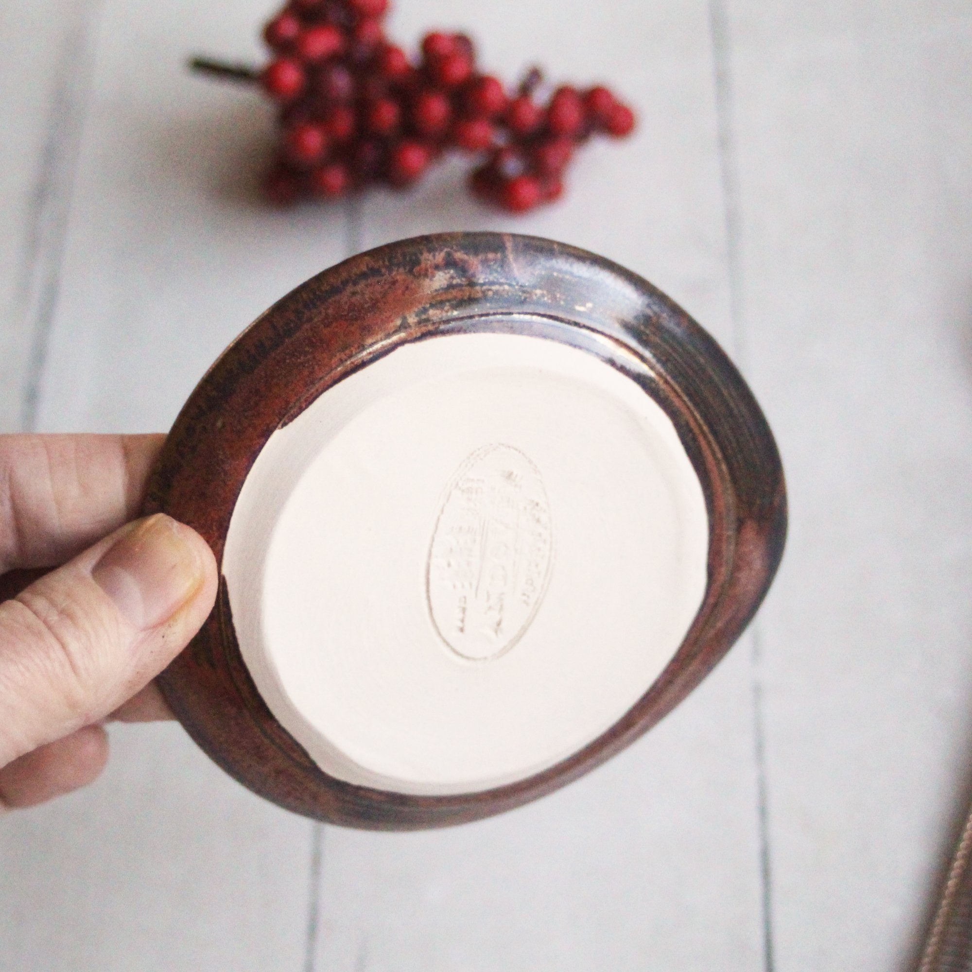This spoon rest was thrown and trimmed on my pottery wheel using a brown speckled stoneware clay. It was bisque fired and glazed with a copper metalic glaze. It was then high fired in my electric kiln. This spoon rest is great for keeping next to your coffee station it will help to keep the mess off of your counter and work space. Approximate size: 3.75-4" wide and 1.5" high Ships for $9 USPS First Class mail. *These are stock photos, the dish you receive will be similar in shape and size but will vary slightly due to each being handmade. View more spoon rests look here Dishwasher safe