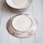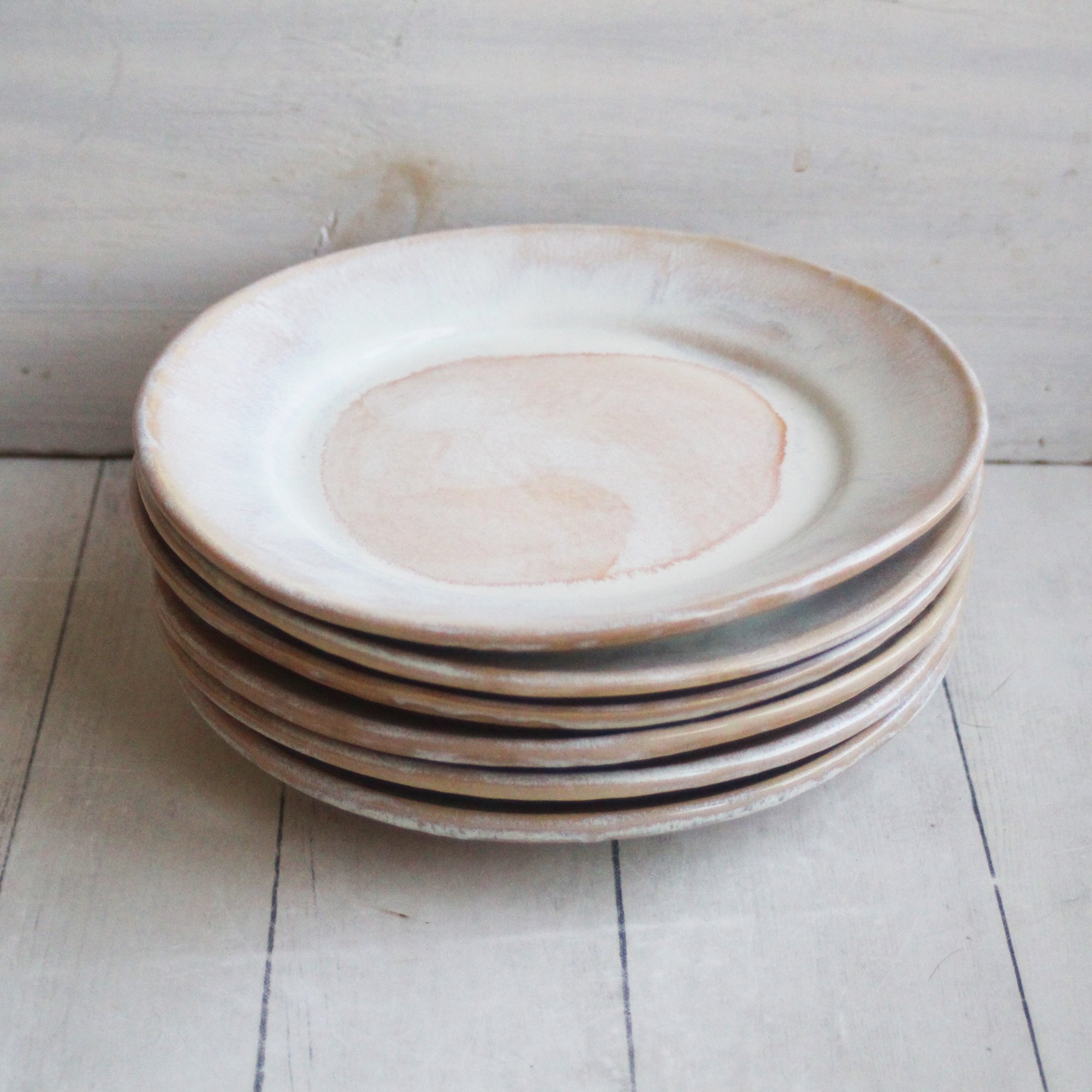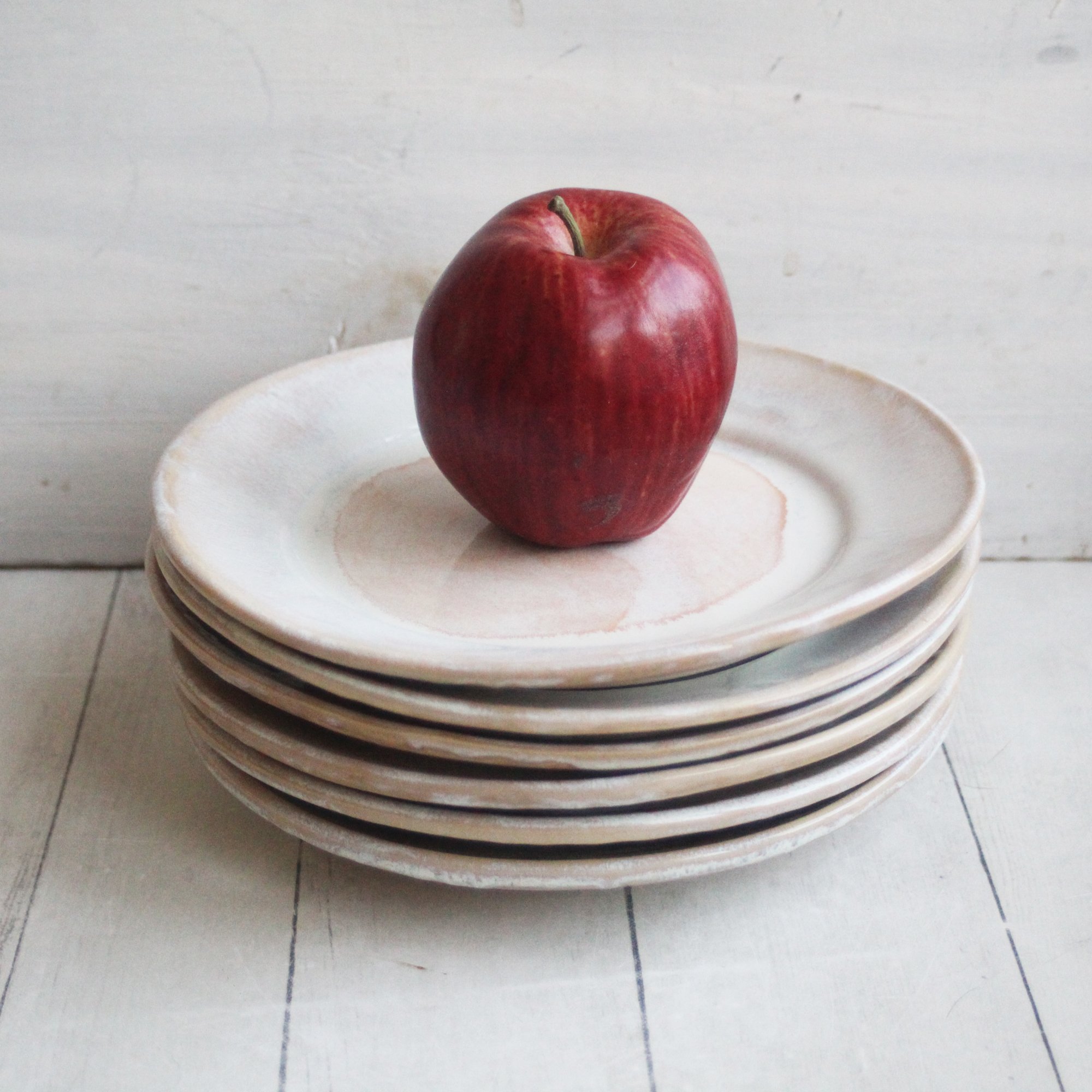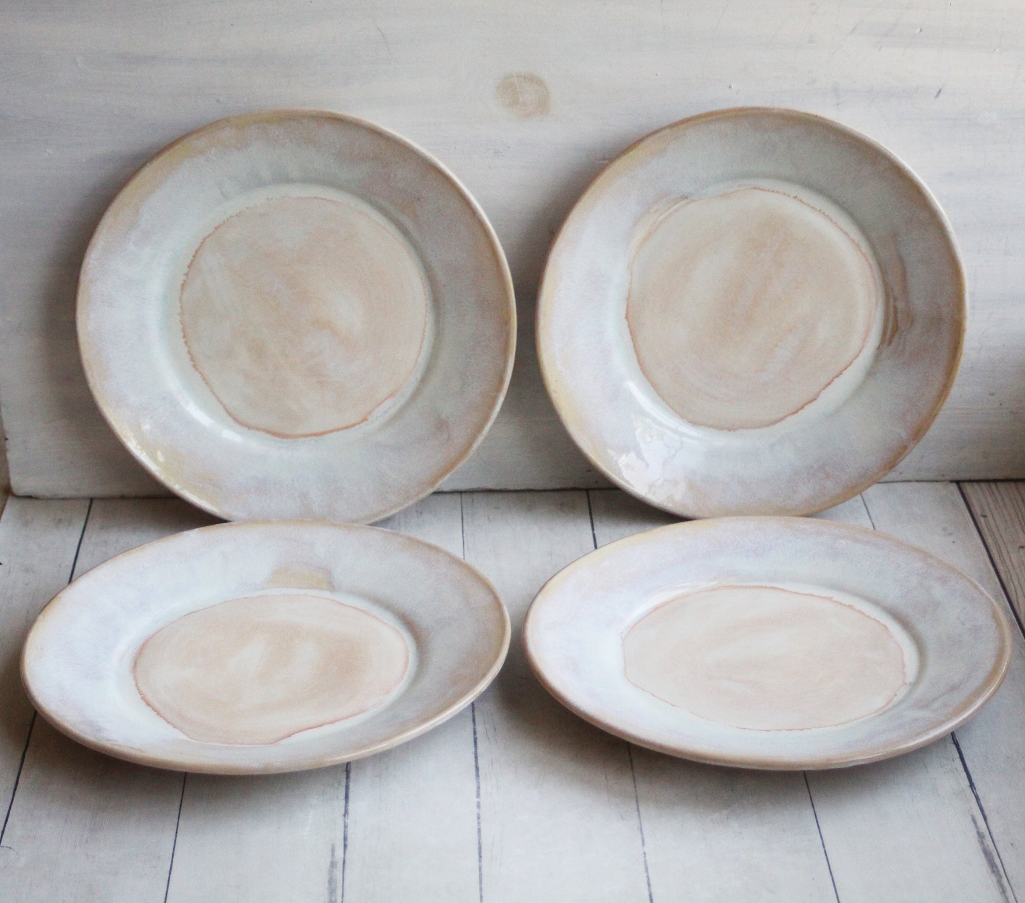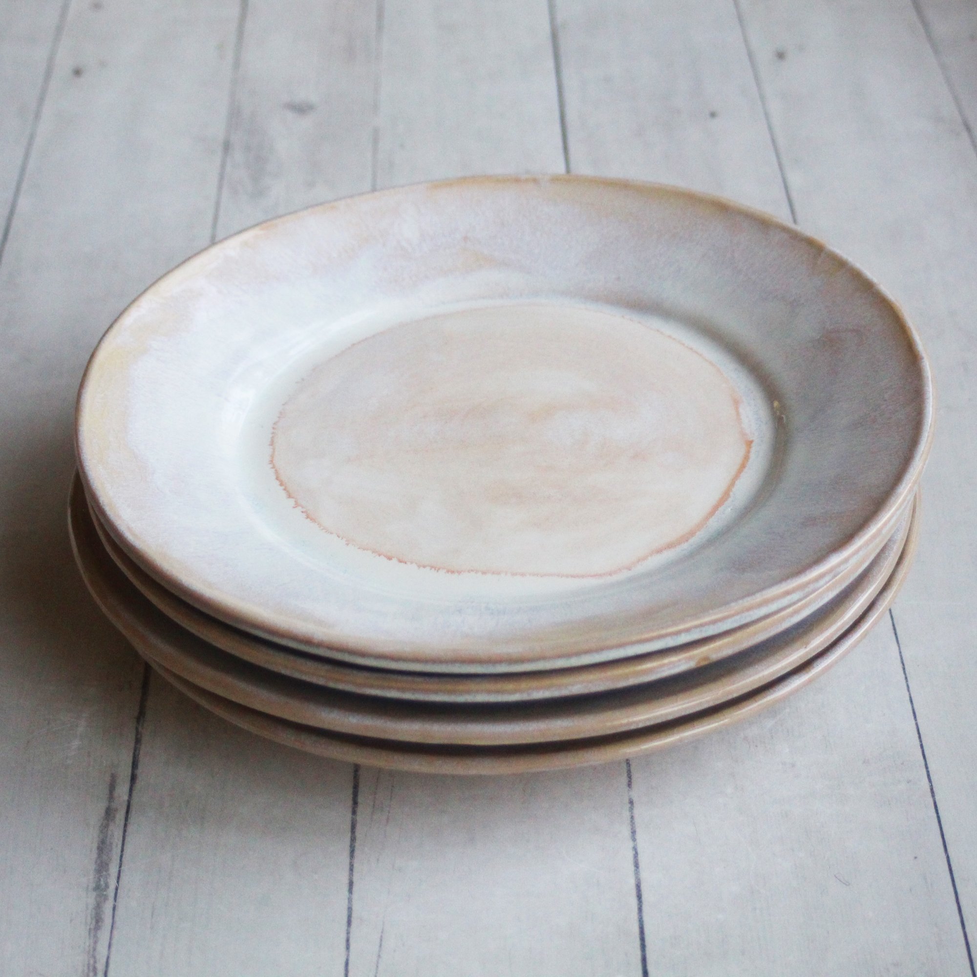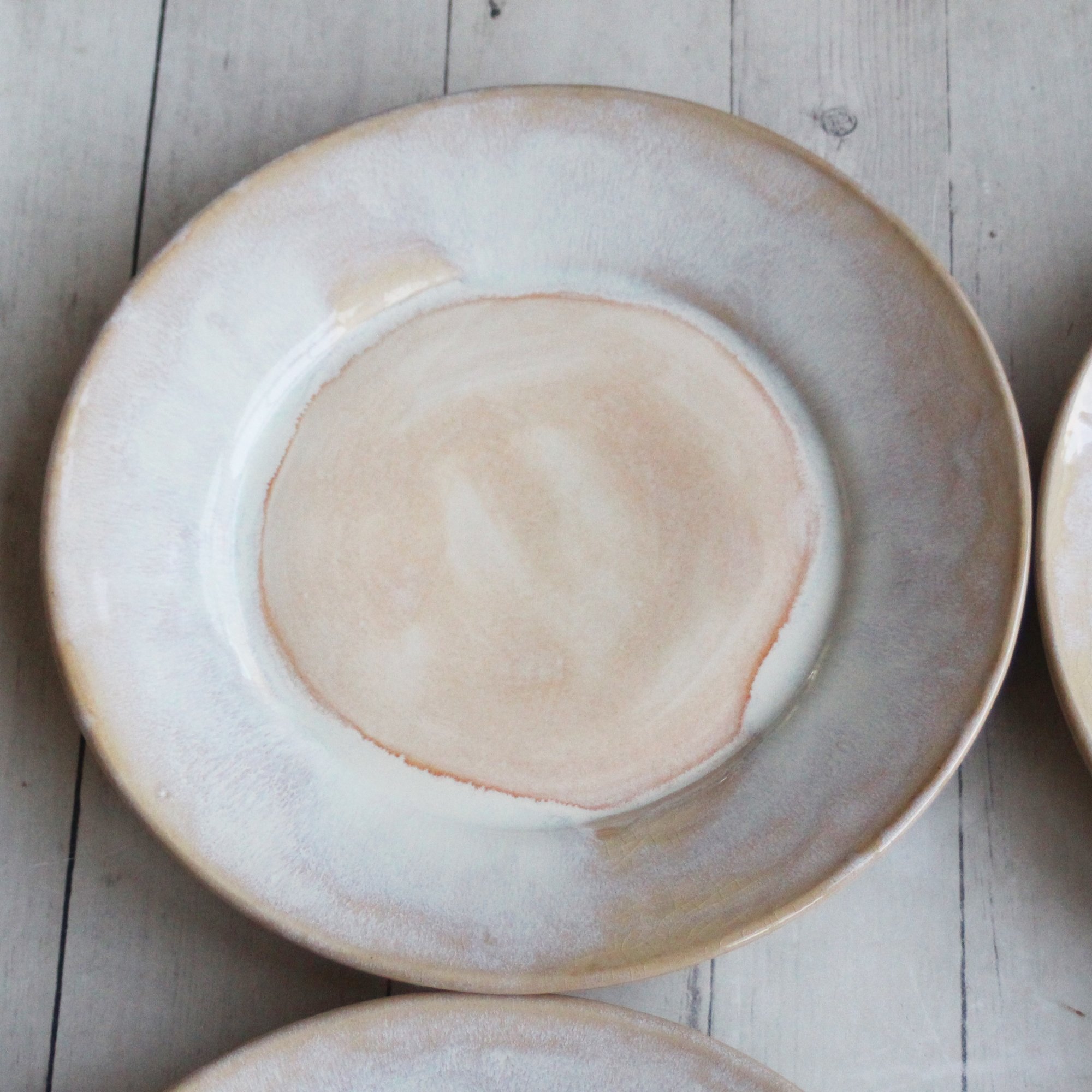 These plates were hand thrown and trimmed on my potter's wheel using a white stoneware clay. They were bisque fired and glazed with a beautiful white glaze that breaks to ocher and then high fired to cone 6 in my electric kiln.