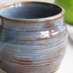 This mug was hand thrown and trimmed on my pottery wheel using white stoneware clay. It was bisque fired and glazed in an earthy blue and amber brown glaze. It was then high fired in my electric kiln.