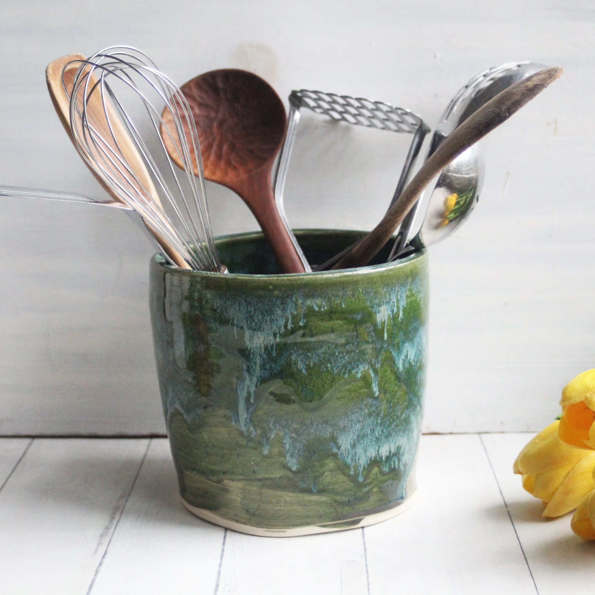 Large Green Utensil Holder, Handcrafted Kitchen Crock, Stoneware Pottery Made in USA