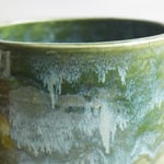 This large rustic utensil holder was hand thrown on my pottery wheel using a white stoneware clay. It was bisque fired and glazed with a textured green glaze and high fired in my electric kiln.