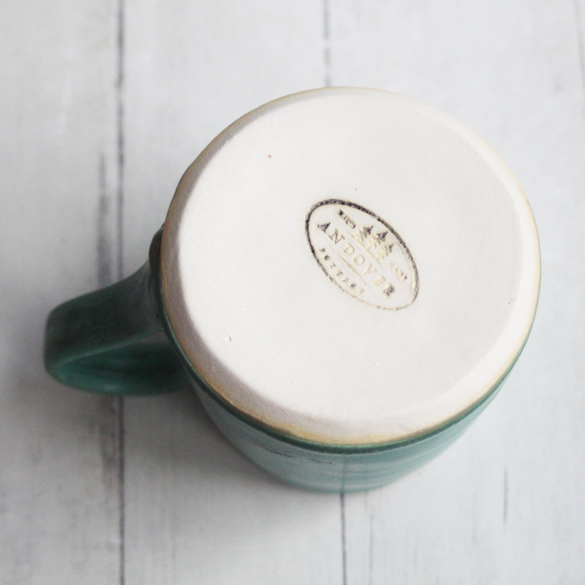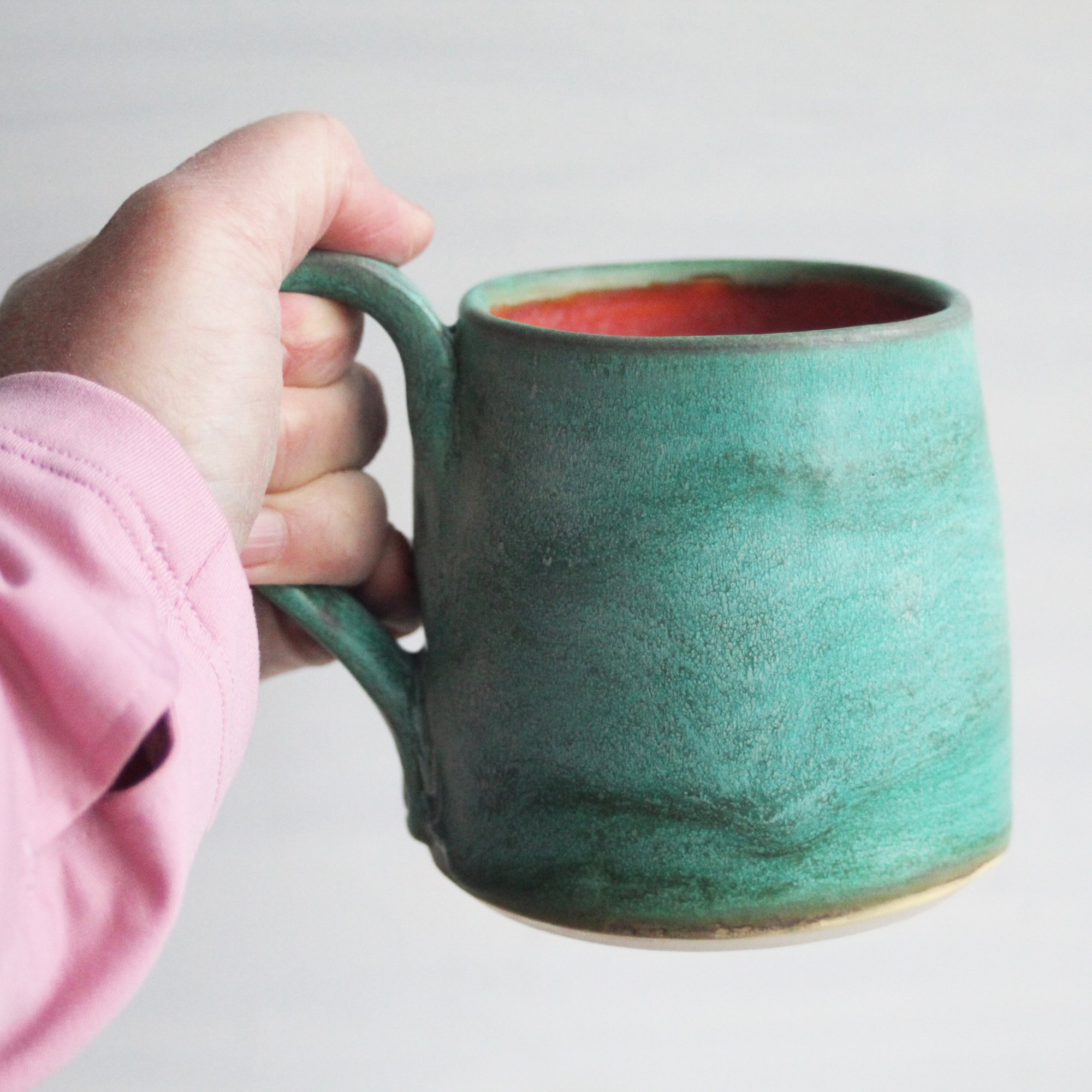 This rustic mug was hand thrown and trimmed on my pottery wheel using a white stoneware clay. It was bisque fired and glazed with a matte copper green glaze on the outside and an orange glaze on the inside. It was then high fired in my electric kiln.