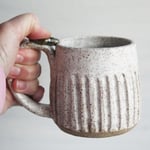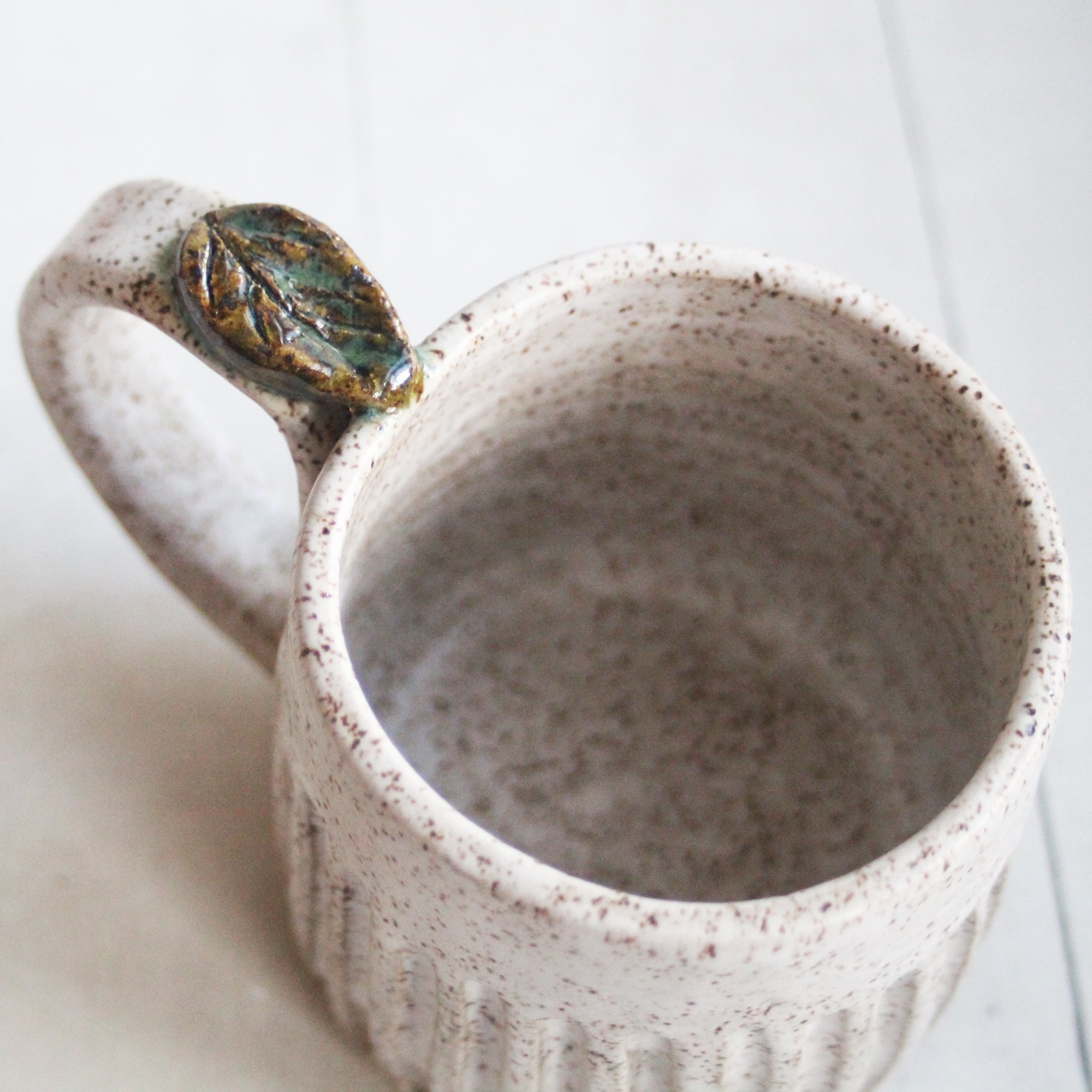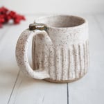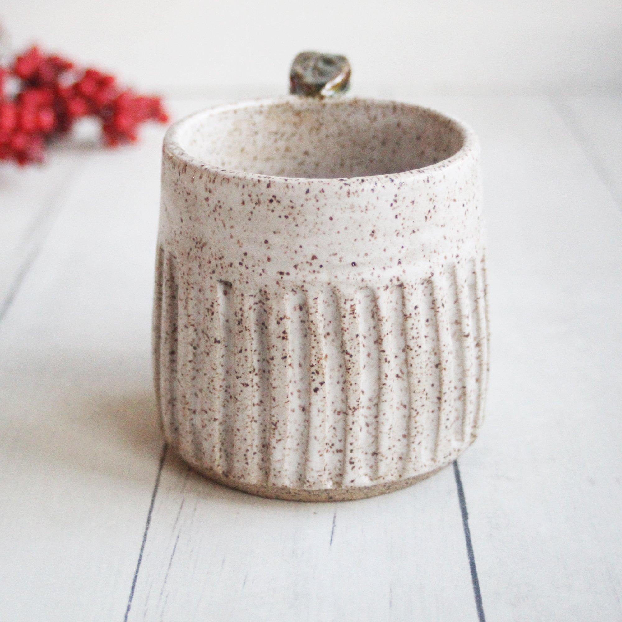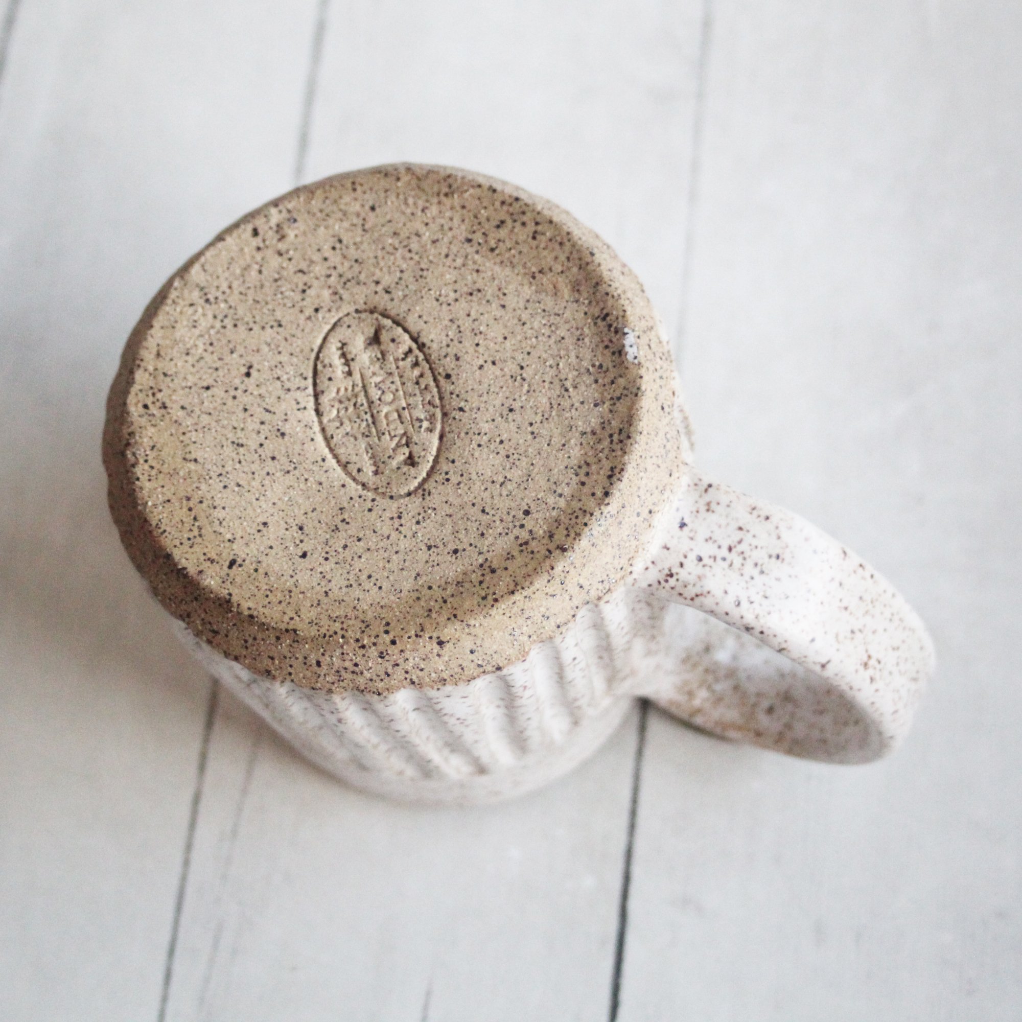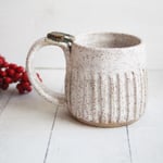 Hand Carved Speckled Pottery Mug in Matte White Glaze, 12 Ounce Rustic White Speckled Coffee Cup