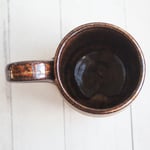 This rustic mug was hand thrown and trimmed on my pottery wheel using a brown stoneware clay. It was bisque fired and glazed with a warm brown glaze on the inside and left unglazed on the outside. It was then high fired in my electric kiln.