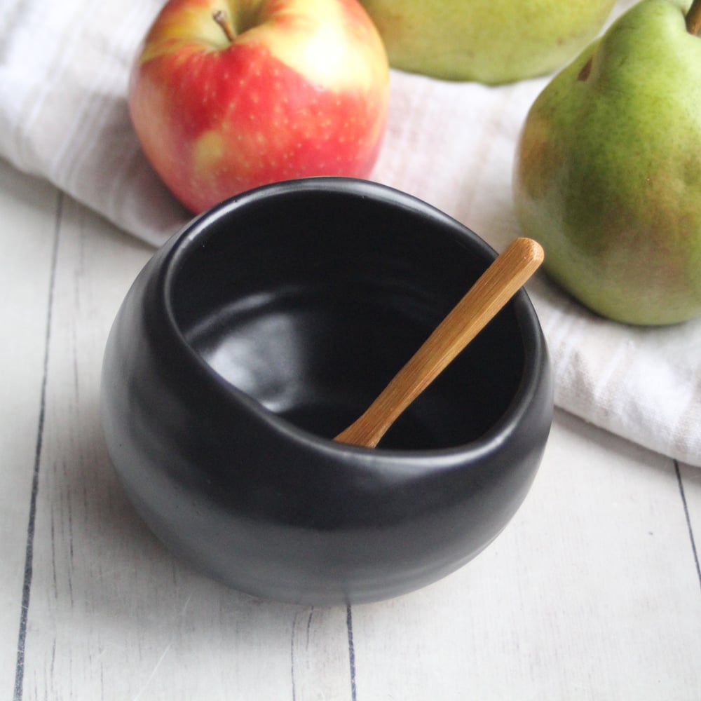 This salt cellar was hand thrown and trimmed on my pottery wheel using a brown speckled stoneware clay. It was bisque fired and carefully glazed with a satin finish black glaze and high fired in my kiln.